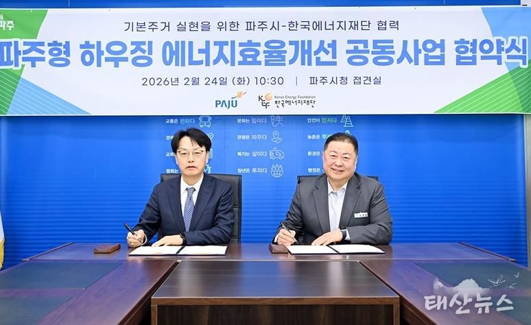 태산뉴스 이동욱 기자 | 파주시는 지난 24일 한국에너지재단과 ‘기본주거 실현을 위한 파주형 하우징 에너지효율개선 공동사업’업무협약을 체결했다.