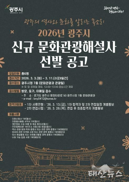 태산뉴스 이동욱 기자 | 광주시는 2026년도 광주시 문화관광 해설사 신규 선발을 위해 오는 3월 3일부터 11일까지 원서 접수를 실시한다고 25일 밝혔다.