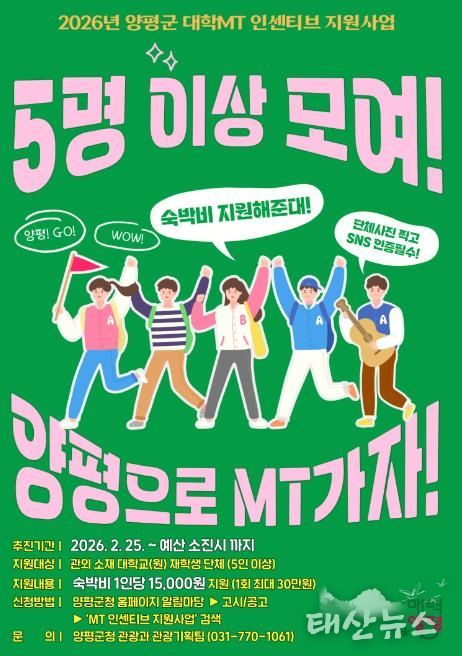 태산뉴스 이동욱 기자 | 양평군은 25일부터 관외 대학생들의 지역 방문을 유도하고 관광 활성화를 도모하기 위해 ‘2026년 양평군 대학 엠티(MT) 인센티브 지원 사업’을 본격 시행한다고 밝혔다.