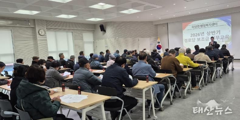 태산뉴스 이동욱 기자 | 미양면은 지난 2월 24일(화) 미양면 행정복지센터 3층 대회의실에서 관내 경로당 회장 및 총무 72명을 대상으로 ‘2026년 상반기 경로당 보조금 집행 역량 강화 실무교육’을 실시했다.