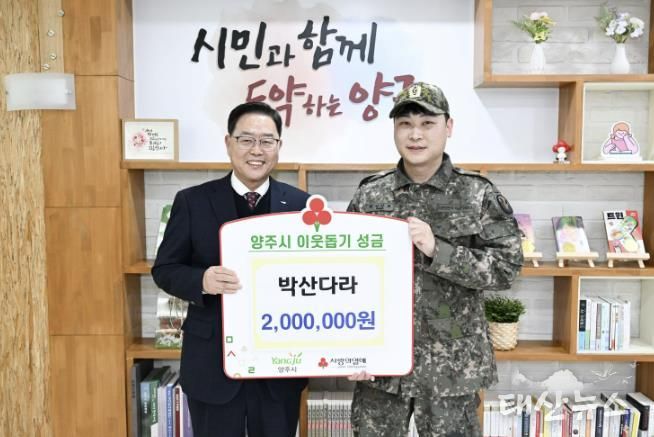 태산뉴스 이동욱 기자 | 양주시는 지난 23일 시장실에서 박산다라 옥정2동 예비군 동대장으로부터 이웃돕기 성금 200만 원을 기탁받았다고 밝혔다.