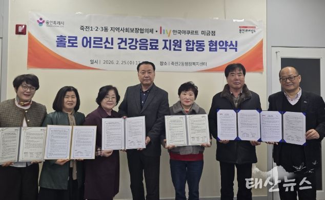 태산뉴스 이동욱 기자 | 용인특례시 수지구 죽전1·2·3동 지역사회보장협의체는 25일 죽전2동 행정복지센터에서 ㈜hy 미금점과 ‘홀로어르신 건강음료 지원’ 사업 협약을 체결했다고 26일 밝혔다.