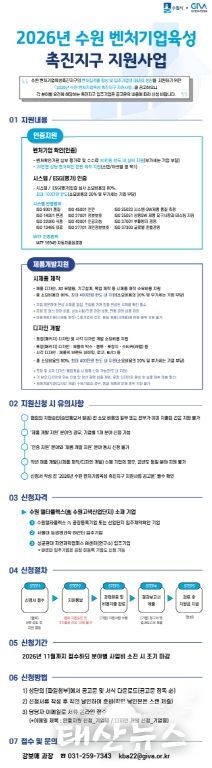 태산뉴스 이동욱 기자 | 수원특례시가 수원 벤처기업육성촉진지구 내 중소·벤처기업을 대상으로 인증과 제품 개발을 지원하는 ‘2026년 수원 벤처기업육성촉진지구 활성화사업’에 참여할 기업을 모집한다.