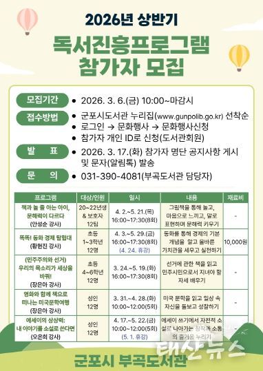 태산뉴스 이지율 기자 | 군포시 부곡도서관은 지역 주민들에게 올바른 독서 환경을 제공하고 책 읽는 즐거움을 선사하기 위해 ‘2026년 상반기 독서진흥프로그램’을 운영한다고 밝혔다.