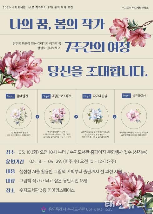 태산뉴스 이동욱 기자 | 용인특례시 수지도서관은 오는 3월 18일부터 운영하는 시민 작가 양성 프로그램 ‘나의 꿈이 책이 되는 7주간의 여정, AI로 그림책 작가 되기’ 1기 참여자를 모집한다고 27일 밝혔다.