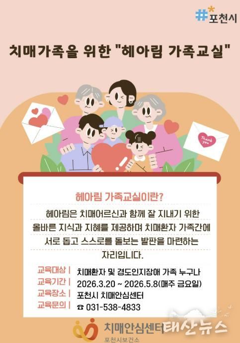 태산뉴스 이동욱 기자 | 포천시 치매안심센터는 오는 3월 20일부터 치매환자 가족을 대상으로 상반기 ‘헤아림’ 가족교실 프로그램을 운영하고, 참여자를 모집한다.