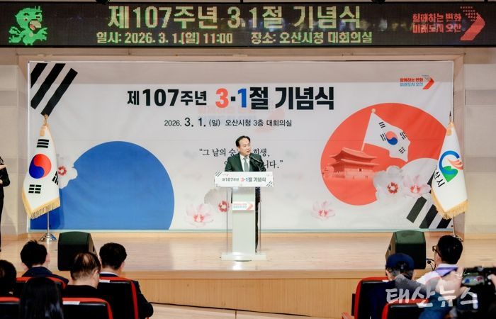 태산뉴스 김준수 기자 | 오산시는 1일 오산시청 대회의실에서 ‘제107주년 3·1절 기념식’을 개최하고 순국선열의 숭고한 희생정신을 기리며 3·1운동의 의미를 되새기는 시간을 가졌다.