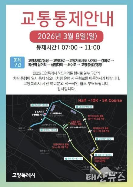 태산뉴스 이동욱 기자 | 고양특례시는 오는 8일‘2026 고양특례시 하프 마라톤 대회’ 개최 로 고양시 주요 도로에서 교통 통제가 이루어짐에 따라 시민들의 적극적인 협조를 당부한다고 밝혔다.