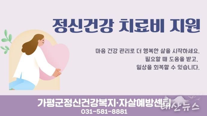 태산뉴스 이동욱 기자 | 가평군정신건강복지센터는 정신질환 치료 과정에서 발생하는 병원비 부담을 덜어주기 위해 치료비 지원사업을 운영중이라고 3일 밝혔다.