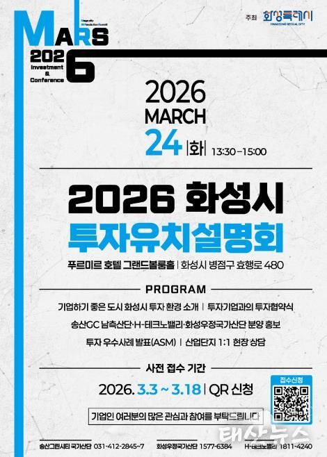 태산뉴스 이동욱 기자 | 화성특례시가 오는 3월 24일 푸르미르 호텔에서 ‘2026 화성특례시 투자유치 설명회’를 개최하고, 3월 3일부터 3월 18일까지 QR코드를 통한 사전접수를 진행한다.