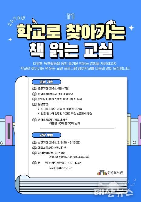 태산뉴스 이동욱 기자 | 수원시 선경도서관은 ‘2026년 학교로 찾아가는 책 읽는 교실’에 참여할 팔달구 관내 초등학교를 13일까지 모집한다.