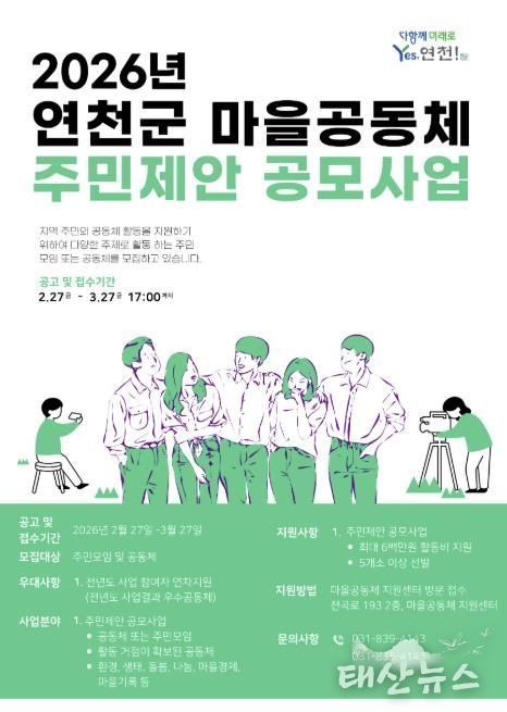 태산뉴스 이동욱 기자 | 연천군이 주민 모임과 공동체를 대상으로 ‘2026년 연천군 마을공동체 주민제안 공모사업’ 참여단체를 모집한다.
