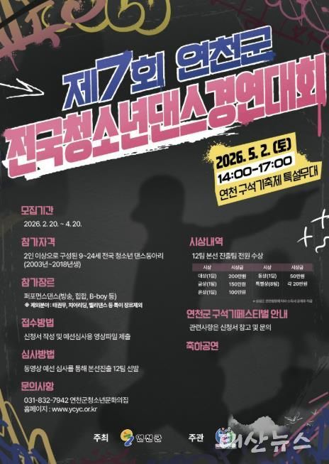 태산뉴스 이동욱 기자 | (재)연천군청소년육성재단(청소년문화의집)은 전국 청소년들이 꿈과 열정을 마음껏 펼칠 수 있는 무대를 마련하고, 창의적인 문화예술 활동을 확산하기 위해 제7회 연천군 전국청소년댄스경연대회를 개최한다고 밝혔다.