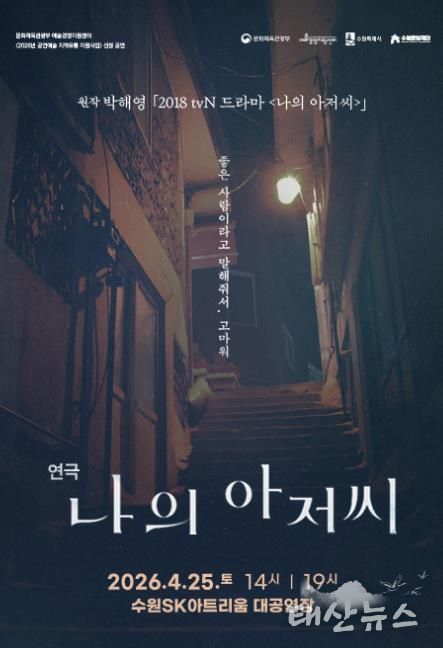 수원문화재단 관계자는 “수원SK아트리움은 전 세대가 공감할 수 있는 우수한 기획 공연을 꾸준히 선보여 왔다”며, “이번 ‘나의 아저씨’에서는 각자의 삶을 돌아보게 하는 따뜻한 이야기를 선보일 예정으로, 가족, 연인, 친구와 함께 공연장에서 봄날의 특별한 시간을 보내시길 바란다”고 전했다.