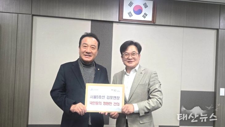 태산뉴스 이동욱 기자 | 김병수 김포시장이 4일 김포시민의 간절한 염원을 담은 국회국민청원서를 들고 직접 국회를 찾았다. 김 시장은 이날 엄태영 국회 국토교통위원회 청원심사소위원장을 면담하고, ‘서울 지하철 5호선 김포·검단 연장 사업’의 신속한 예비타당성조사 통과와 절차 진행을 강력히 촉구했다.