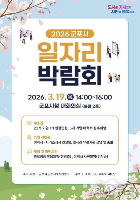 태산뉴스 이동욱 기자 | 군포시는 오는 3월 19일 오후 2시부터 시청 대회의실에서 ‘2026년 군포시 일자리 박람회’를 개최한다. 이번 박람회는 지역 내 우수 기업과 구직자가 직접 만나는 채용의 장으로 제조, 서비스, 물류배송, 의료복지 등 다양한 분야에서 폭넓은 취업 기회를 제공할 예정이다.