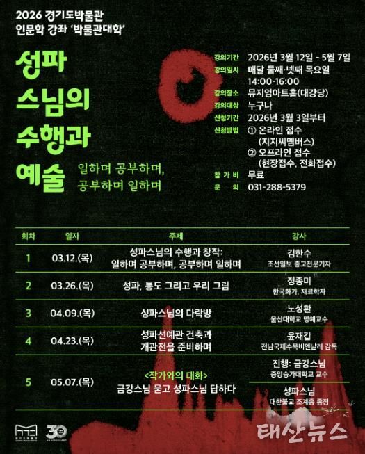 태산뉴스 김준수 기자 | 경기도박물관은 오는 3월 12일부터 ‘2026 경기도박물관 박물관대학(인문학 강좌)’을 운영한다. 경기도박물관 박물관대학(인문학 강좌)은 매년 역사·문화와 관련한 시의성 있는 주제를 선정해 도민에게 제공하는 교육프로그램이다.