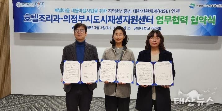 태산뉴스 이동욱 기자 | 의정부시도시재생지원센터는 3월 3일 경민대학교 호텔조리과와 성공적인 빼벌새뜰마을사업을 위해 업무협약을 체결했다.
