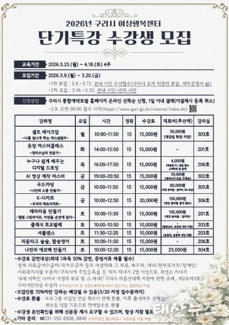 태산뉴스 이동욱 기자 | 구리시 여성행복센터는 오는 3월 23일부터 4주간 2026년 단기 특강 교육프로그램을 운영한다.