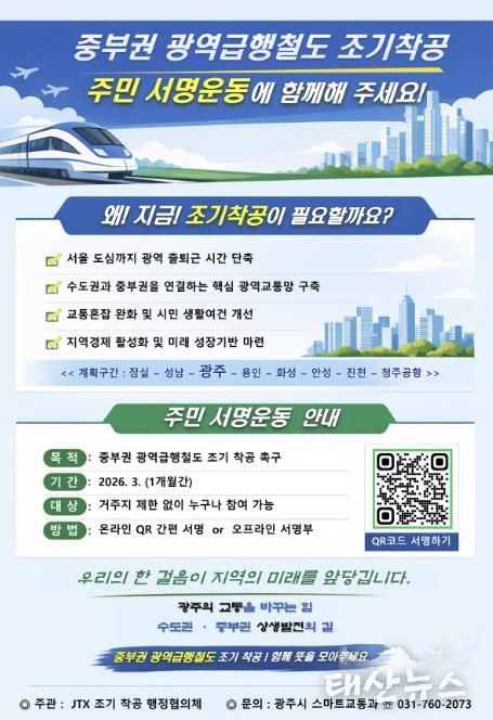 태산뉴스 이동욱 기자 | 광주시는 중부권 광역급행철도의 조기 착공을 촉구하기 위해 3월 한 달간 주민 서명운동을 한다고 6일 밝혔다.