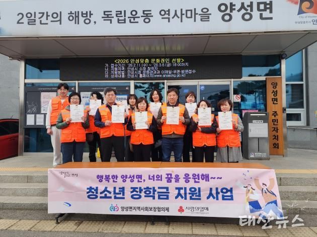 ‘청소년 장학금 지원 사업’은 양성면 아동‧청소년이 건강하게 성장하고 미래에 대한 희망을 키울 수 있도록 돕기 위해 추진되고 있으며, 이번 지원으로 11명에게는 2026년 3월부터 12월까지 매월 10만 원씩(총 100만 원), 2명에게는 2027년 2월까지 매월 10만 원씩(총 120만 원) 지원하며, 총 13명에게 1,440만 원의 장학금이 전달될 예정이다.