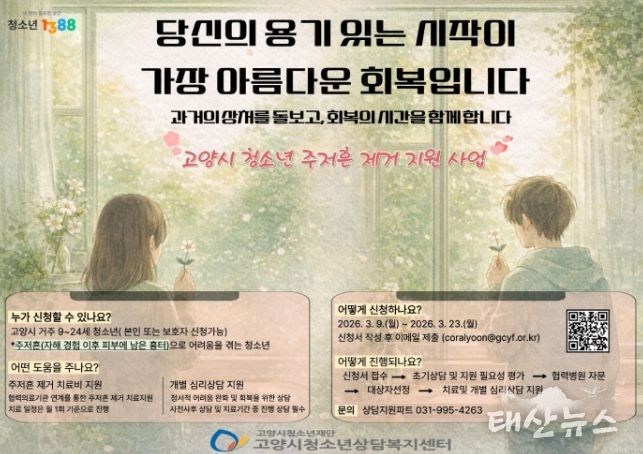 태산뉴스 이동욱 기자 | 고양시청소년재단 고양시청소년상담복지센터는 자살·자해 흔적(주저흔)으로 인해 심리적 위축과 사회생활의 어려움을 겪고 있는 청소년을 지원하기 위해 ‘주저흔(자해 흔적) 제거 지원 사업’을 추진한다고 6일 밝혔다.