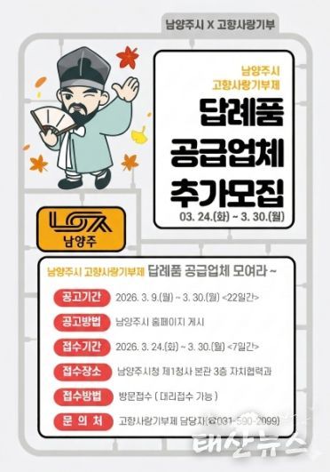 태산뉴스 이동욱 기자 | 남양주시는 오는 3월 24일부터 고향사랑기부제 참여자들에게 제공할 ‘2026년 고향사랑기부제 답례품 공급업체’ 추가 모집 접수를 시작한다고 6일 밝혔다.