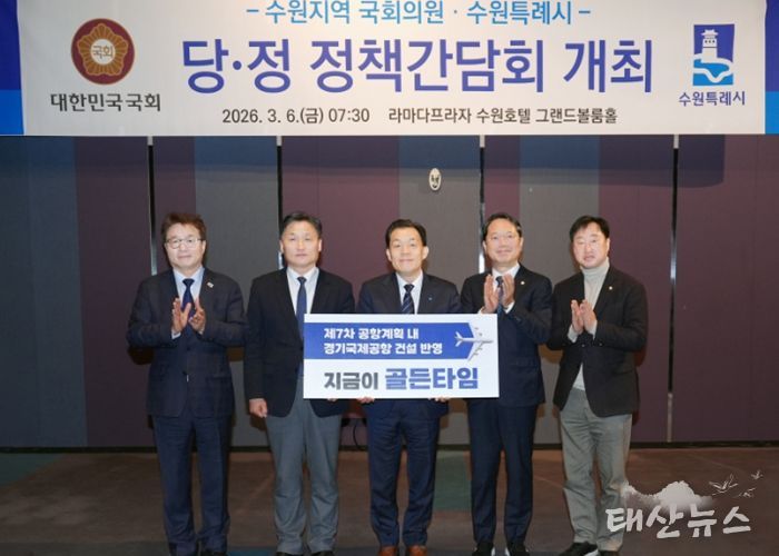 태산뉴스 이동욱 기자 | 이재준 수원특례시장은 6일 라마다프라자 수원호텔에서 열린 지역 국회의원들과 당·정 정책간담회에서 “제7차 공항개발 종합계획에 ‘경기국제공항’ 건설 내용이 반영될 수 있도록, 경기도와 협의해 달라”고 요청했다.
