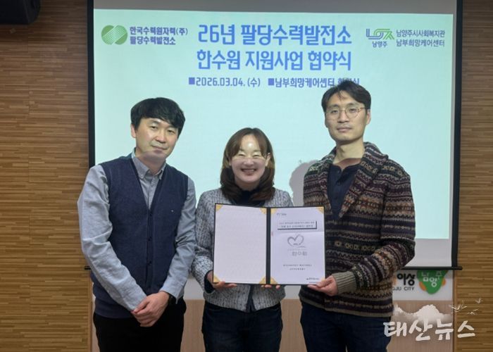 태산뉴스 이동욱 기자 | 남양주시는 지난 4일 남부희망케어센터가 한수원(주)팔당수력발전소와 ‘함께 살기 조(안)와(부)’지원사업 진행을 위한 협약식을 개최하고 지역사회 복지 증진을 위한 협력체계를 구축했다고 6일 밝혔다.