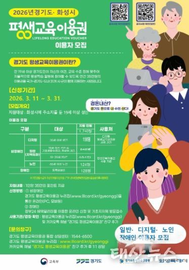 태산뉴스 이동욱 기자 | 화성특례시는 평생학습 소외계층의 학습권을 보장하고 교육격차를 완화하기 위해 ‘2026년 평생교육이용권 지원사업’ 이용자 1차 모집을 오는 3월 11일부터 31일까지 실시한다고 밝혔다.