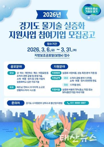 태산뉴스 김준수 기자 | 경기도가 ‘2026년 경기도 물기술 실증화 지원사업’ 참여 기업을 공개 모집한다.
