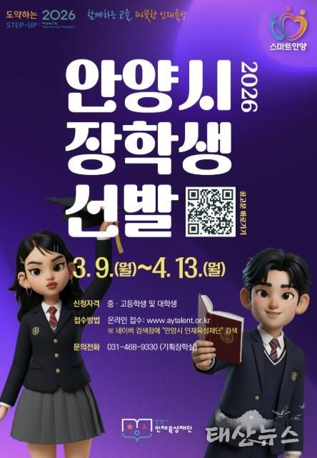 태산뉴스 이동욱 기자 | 안양시 인재육성재단은 안양시 중·고등학생 및 대학생을 대상으로 2026년 상반기 장학생을 선발한다고 9일 밝혔다.