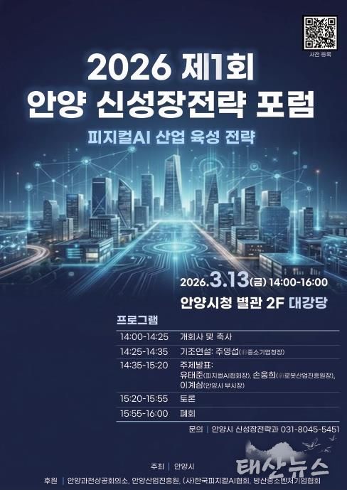 태산뉴스 이동욱 기자 | 안양시는 미래 신산업 육성과 지역 산업 경쟁력 강화를 모색하기 위한 ‘2026 제1회 안양 신성장전략 포럼’을 이달 13일 오후 2시 안양시청 별관 2층 대강당에서 개최한다고 9일 밝혔다.