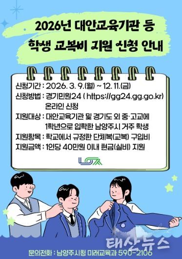 태산뉴스 이동욱 기자 | 남양주시는 대안교육기관 및 경기도 외 지역 중·고등학교에 입학하는 1학년 학생을 대상으로 교복비 지원사업을 추진한다고 9일 밝혔다.