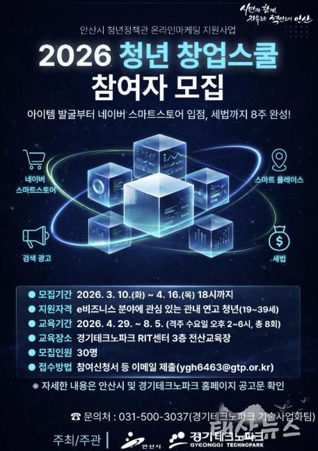 태산뉴스 이동욱 기자 | 안산시는 e비즈니스 분야 청년 창업자의 안정적인 시장 진입과 사업 운영을 지원하기 위해 ‘청년 창업스쿨’ 참여자를 모집한다고 10일 밝혔다.