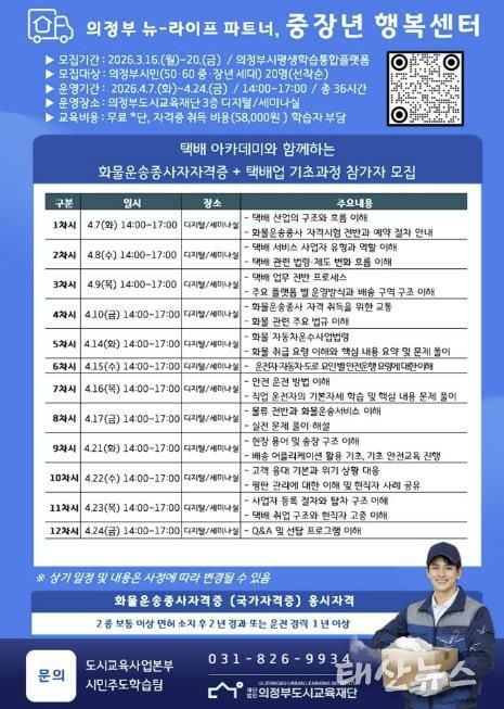 태산뉴스 이동욱 기자 | (재)의정부도시교육재단은 택배 전문 교육기관 택배아카데미와 협력하여, 중장년층의 새로운 도전을 지원하는'화물운송종사자격증+택배업 기초과정'참여자를 3월16일부터 모집한다고 밝혔다.