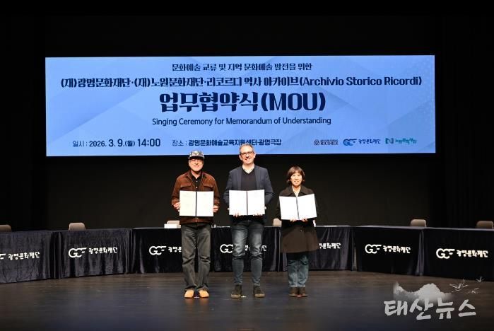태산뉴스 이동욱 기자 | (재)광명문화재단은 3월 9일 오후 2시 광명극장에서 (재)노원문화재단, 리코르디 역사 아카이브(Archivio Storico Ricordi)(이하 리코르디)와 ‘문화예술 교류 및 지역 문화예술 발전’을 위한 업무협약(MOU)을 체결했다고 밝혔다.