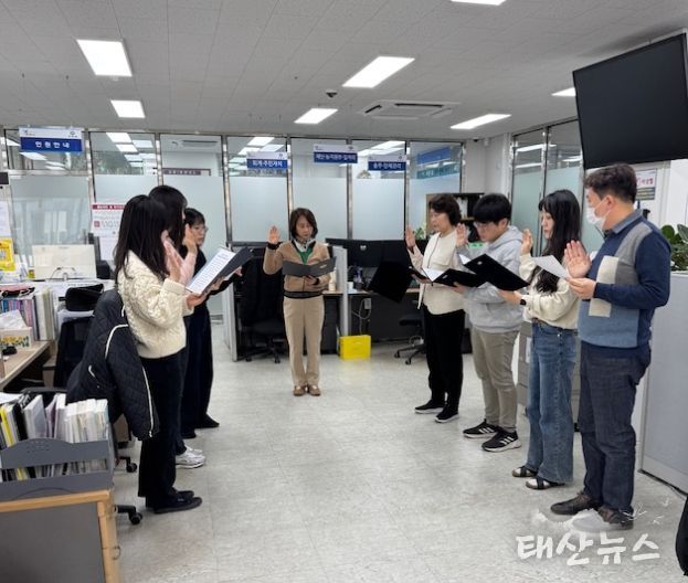 태산뉴스 이동욱 기자 | 구리시 교문1동 행정복지센터는 지난 9일 민원인에게 더 친절하고 책임감 있는 행정서비스를 제공하기 위해‘민원 친절 다짐 선언’을 실시했다.