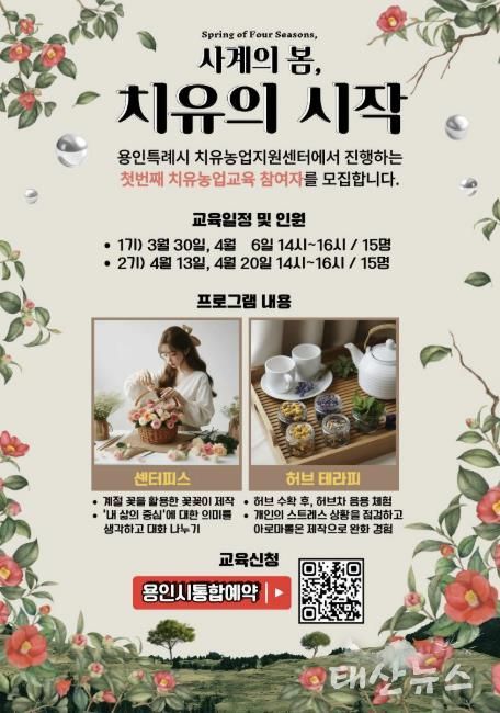 태산뉴스 이동욱 기자 | 용인시 농업기술센터는 치유농업지원센터에서 오는 3월 20일부터 4월 20일까지 치유농업 프로그램 ‘사계의 봄(Spring of Four Seasons), 치유의 시작’을 운영한다고 11일 밝혔다.