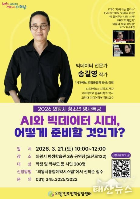 태산뉴스 이동욱 기자 | 의왕시 진로진학상담센터가 3월 21일 오전 10시, 의왕시 평생학습관(오전로 122)에서 청소년과 시민을 대상으로 '2026 상반기 청소년 명사특강'을 개최한다.