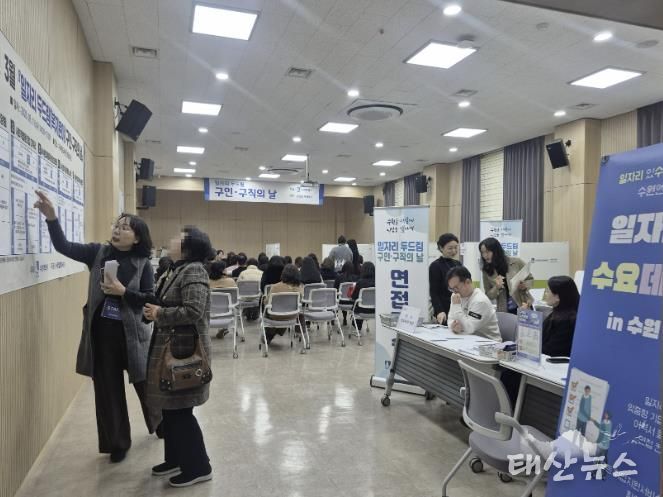 태산뉴스 이동욱 기자 | 수원특례시가 11일 북수원도서관 강당에서 개최한 ‘3월 일자리 두드림 구인·구직의 날’ 채용 행사에서 53명이 현장 면접을 봤다. 2차 면접 예정자는 12명이다.