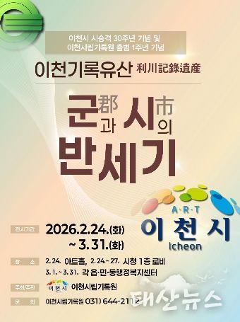 태산뉴스 이동욱 기자 | 이천시는 시 승격 30주년과 이천시립기록원 출범 1주년을 기념하여 기획된 ‘이천기록유산(利川記錄遺産): 군(郡)과 시(市)의 반세기’ 전시를 오는 3월 31일까지 14개 읍면동 행정복지센터에서 순회전시로 연장 개최한다고 밝혔다.