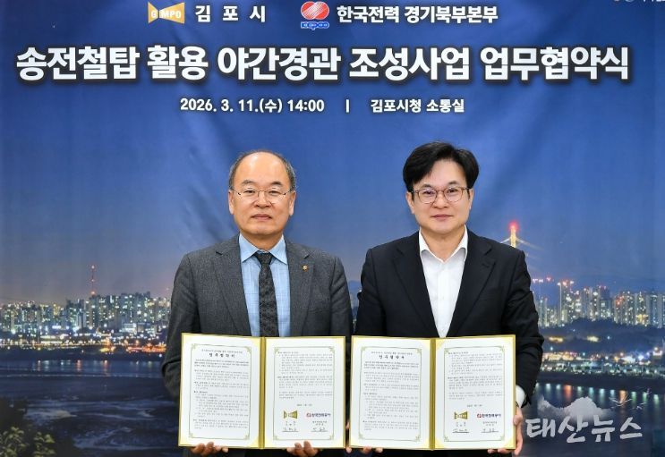 태산뉴스 이동욱 기자 | 김포시와 한국전력공사 경기북부본부가 11일 ‘송전철탑 활용 야간경관 조성사업’ 추진을 위한 업무협약을 체결했다. 이번 협약은 송전철탑을 활용한 야간경관 랜드마크 조성을 통해 도시 환경과 전력 설비에 대한 이미지를 개선하고 시민들에게 새로운 볼거리를 제공하기 위해 마련됐다.