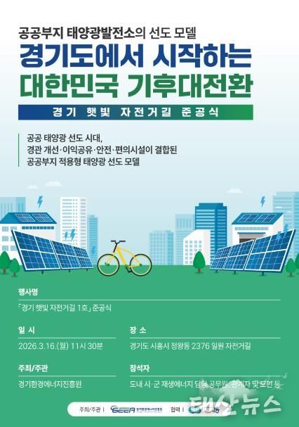 태산뉴스 김준수 기자 | 경기환경에너지진흥원은 16일 시흥시 정왕동 2376일원 자전거길에서 ‘경기 햇빛 자전거길 1호’ 준공식을 개최한다고 13일 밝혔다.