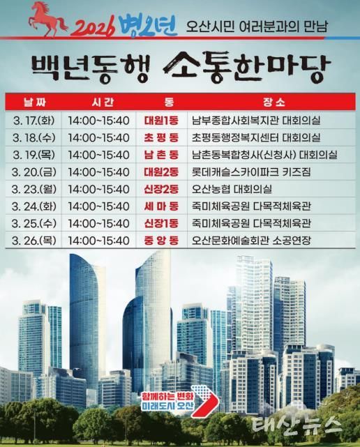 태산뉴스 김준수 기자 | 오산시가 시민과 직접 만나 시정 운영 방향을 공유하고 지역 현안을 듣는 ‘2026 백년동행 소통한마당’을 개최한다.