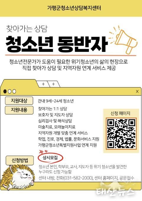 태산뉴스 이동욱 기자 | 가평군청소년상담복지센터는 청소년 상담 분야 자격과 경험을 갖춘 전문상담사가 위기 청소년을 지원하는 ‘청소년동반자 프로그램’을 운영중이라며 적극적인 이용을 당부했다.