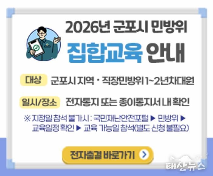 태산뉴스 이동욱 기자 | 군포시는 민방위대원의 비상 시 대응 역량 강화를 위해 ‘2026년 민방위 기본교육’을 실시한다.