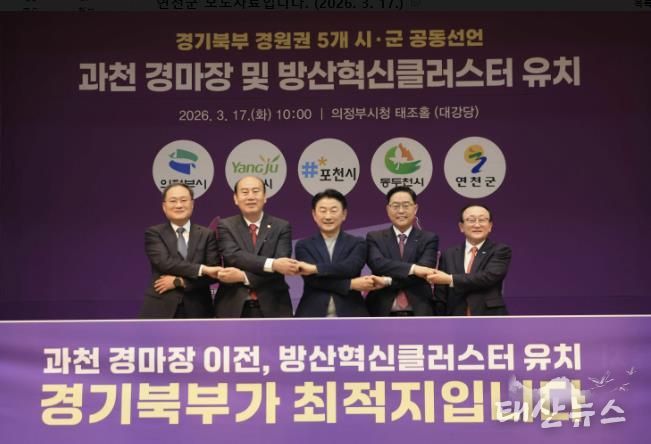 태산뉴스 이동욱 기자 | 연천군은 17일 의정부시청 태조홀에서 열린 ‘경기북부(경원권) 5개 시ㆍ군 공동선언식’에 참석해 과천경마공원(렛츠런파크 서울) 및 경기도 방산혁신클러스터의 경기북부 유치를 강력히 촉구했다고 밝혔다.