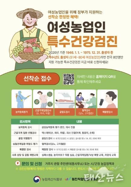 여성농업인 특수건강검진은 농작업으로 인해 발생할 수 있는 질환을 조기에 발견하고 건강 위험 요인을 체계적으로 관리하기 위한 사업이다. 검진 항목은 근골격계, 심혈관계, 골절·손상 위험도, 폐활량, 농약 중독 검사 등으로 구성되며, 검진 이후에는 사후관리 예방교육과 전문의 상담도 함께 제공된다.