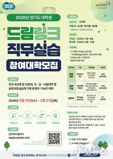 태산뉴스 김준수 기자 | 경기도와 경기도일자리재단이 ‘경기도 대학생 드림링크 직무실습’ 사업에 참여할 15개 협력대학을 31일까지 모집한다.